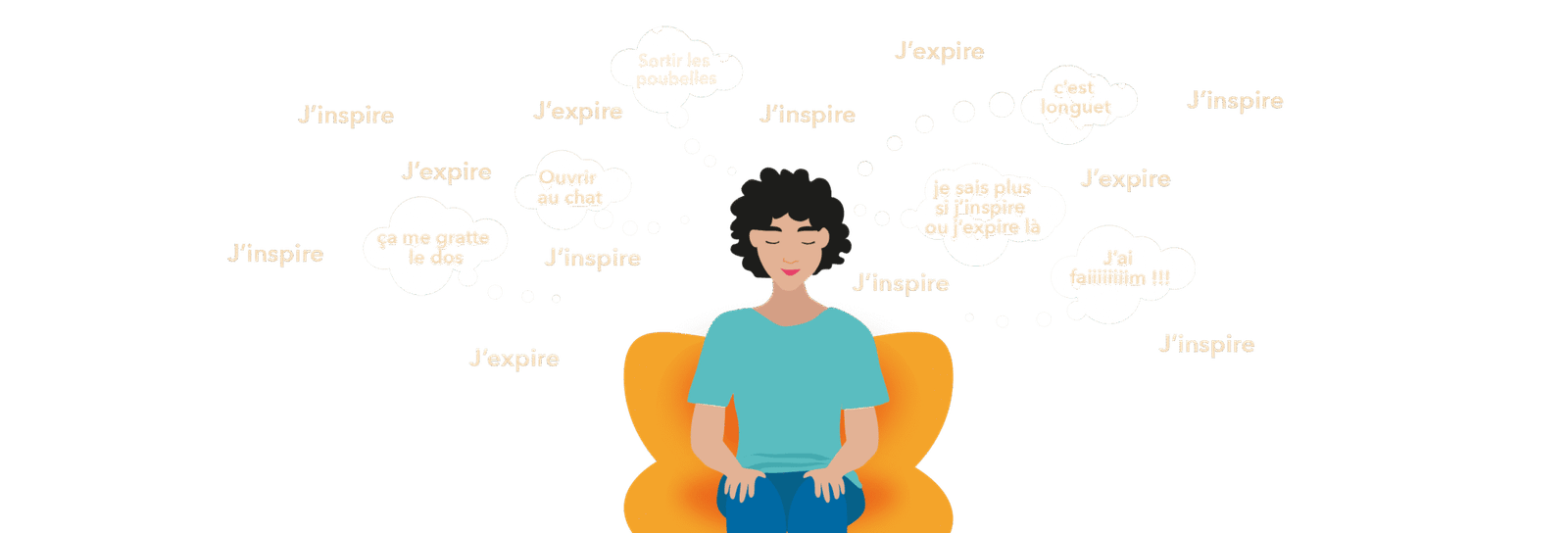 Je ferme les yeux, et utilise la technique du comptage, pour éviter que mon cerveau ne dérive trop. J’inspire et à 1 j’expire, j’inspire et à 2 j’expire, et ainsi de suite jusqu’à 10 puis je redescends en sens inverse. Ah mince, je suis à 22, qu’est-ce que je fous là, moi. Mais j’ai pas oublié de payer la facture d’électricité ? Allez, 9 j’expire, j’inspire, 8 j’expire, j’étais pas à 5, déjà. Non, mais c’est un peu long quand même. Il a dit quoi, le prof ? Laissez passer les nuages dans votre cerveau, ils ne vous atteignent pas. C’est fou ce que ça donne faim cette pause. Et puis j’ai mal au dos, je ne m’en étais pas rendue compte que j’avais mal au dos mais avec cette immobilité, là !!! C’est qui, ça ? Le chat ? Dégage, le chat, tu ne vois pas que je médite ? Bon, c’est pas fini ces 5 minutes, c’est quand la cloche ? Et puis ça donne faim tout ça ?